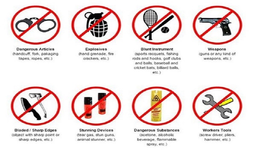- Không được mang các loại vật liêu dễ gây cháy nổ, bén nhọn, dao, kéo, dao đa năng, các loại hung khí.