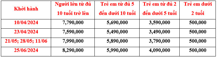 Giá tour trẻ em : Áp dụng theo bảng giá. Độ tuổi sẽ được tính từ ngày sinh đến ngày khởi hành.