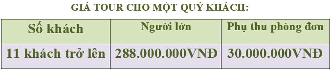 - 1 Hướng dẫn viên chuyên nghiệp đi từ Việt Nam nhiệt tình phục vụ suốt tuyến và hướng dẫn viên địa phương chuyên nghiệp ( Đã bao gồm tiền TIP)