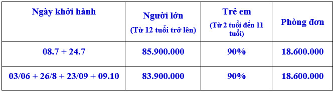 Khởi hành: 03/6; 8/7; 24/7; 26/ 8; 23/9; 9/10