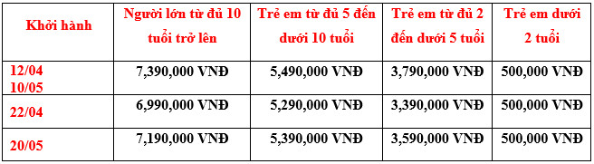 Giá tour trẻ em : Áp dụng theo bảng giá. Độ tuổi sẽ được tính từ ngày sinh đến ngày khởi hành.