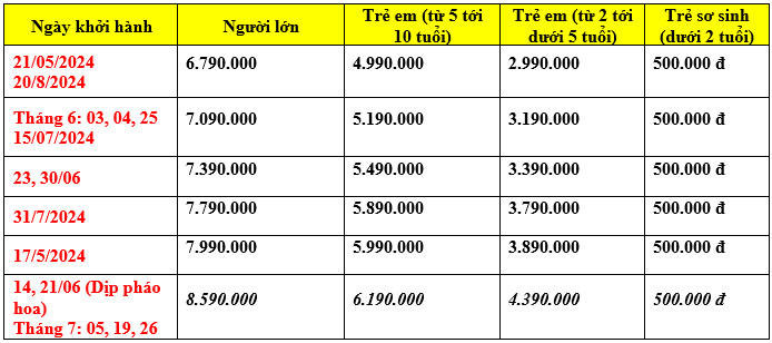 GIÁ TOUR TRẺ EM: Áp dụng theo bảng giá. Độ tuổi sẽ được tính từ ngày sinh đến ngày khởi hành.