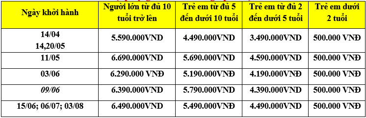 Giá tour trẻ em: Áp dụng theo bảng giá. Độ tuổi sẽ được tính từ ngày sinh đến ngày khởi hành.