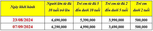 Giá tour trẻ em : Áp dụng theo bảng giá. Độ tuổi sẽ được tính từ ngày sinh đến ngày khởi hành.