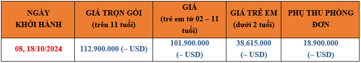 Ngày khởi hành: 08/10, 18/10/2024
