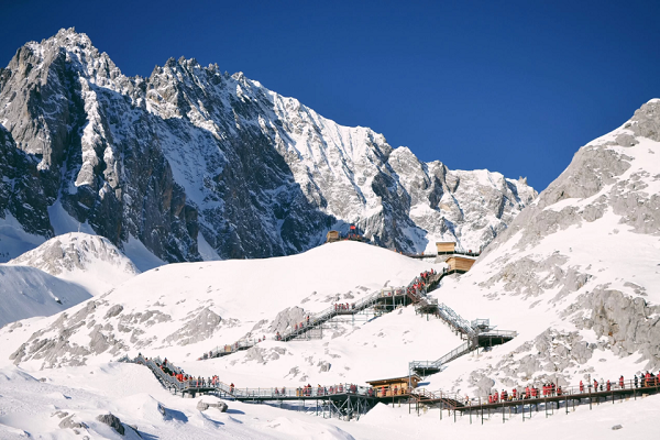 Khu lịch Núi Tuyết Ngọc Long: Quý khách đi cáp treo nhỏ lên Vân Tam Bình độ cao 3200m ngắm cảnh đẹp Núi tuyết Ngọc Long - ngọn núi cao 5596m tuyết phủ quanh năm. Phần băng vĩnh cửu ánh lên một màu xanh như ngọc.