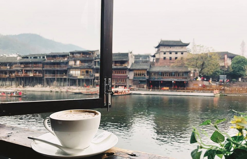 Thật lạ khi ngay tại đất Trung Quốc mà ta lại được thưởng thức những cốc Capuchino, Latte, Machiato,... chứ không phải là trà. Dường như nơi đây đã kịp bắt nhịp mà thích nghi với dịch vụ du lịch nên những món cà phê này lại có tên tuổi tại đây. Dọc theo bờ Đà Giang là những quán cà phê rất xinh xắn, có nơi để ngắm cảnh hồ khi đèn thắp sáng lung linh. Kinh nghiệm du lịch Phượng Hoàng cổ trấn của những người đã đi cho biết giá cả cũng thuộc loại vừa phải chỉ từ 28-30 tệ/ cốc. Bên cạnh đó còn có những quán bar phục vụ lúc đêm khuya.