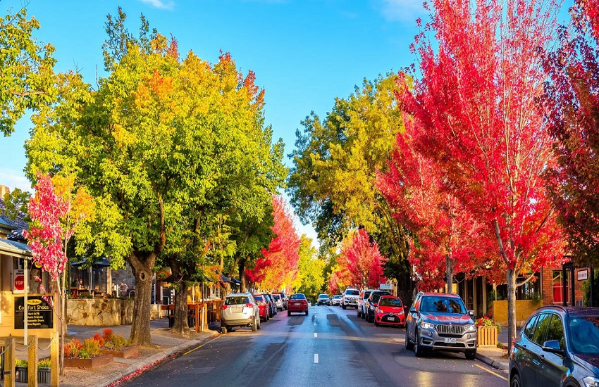 Mùa thu kéo dài từ tháng 3 tới tháng 5 ở hầu hết các thành phố ở nước Úc. Bạn sẽ để ý thấy nước mảnh đất này như khoác lên mình một chiếc áo khác khi những vòm lá, lá cây chuyển dần sang màu đỏ đặc trưng vốn có của nó. Những cánh rừng lá kim, những ngôi làng dường như chìm dần vào làn sương trắng muốt vào sáng sớm tại thung lũng Yarra.