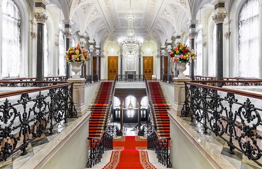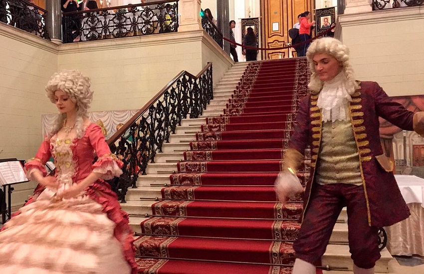- Tứ tấu cổ điển đang chơi những giai điệu đáng yêu của thế kỷ XVIII; một Quý cô lộng lẫy trong bộ váy cưới và một Quý ông đẹp trai đang chào đón các vị khách tại Cầu thang Gala của Cung điện.